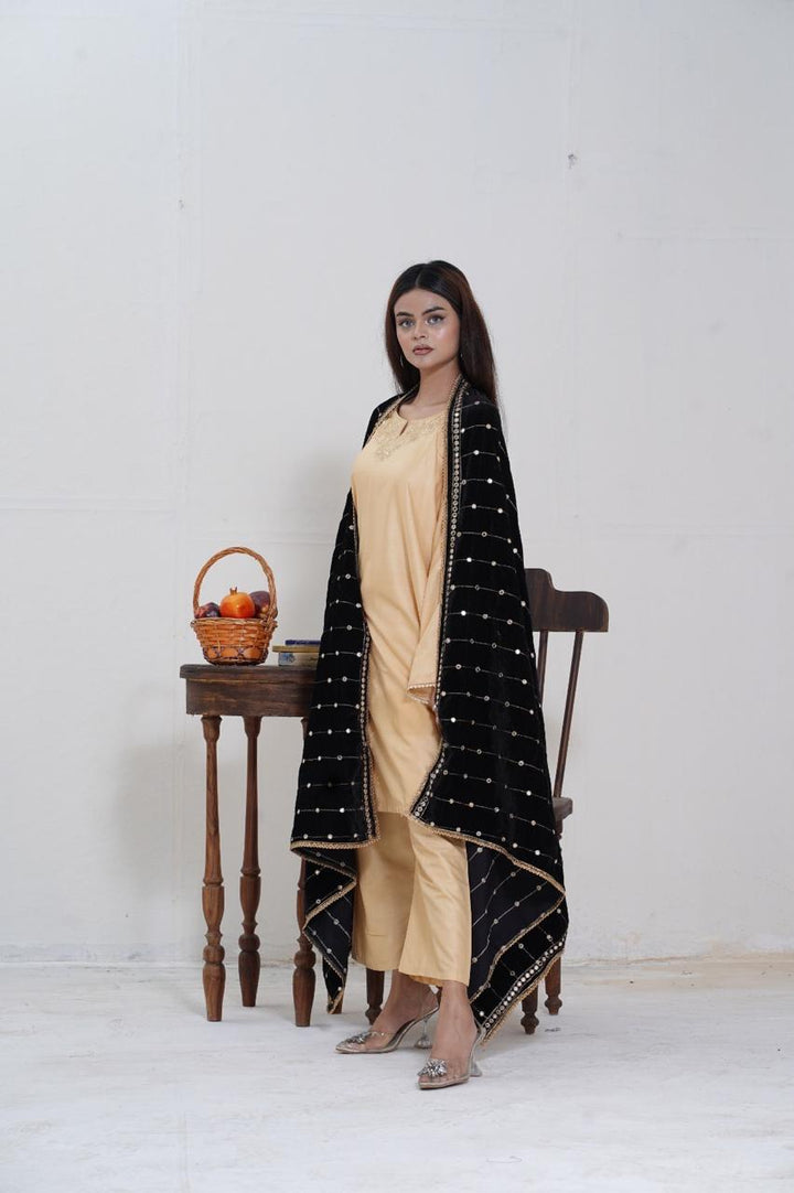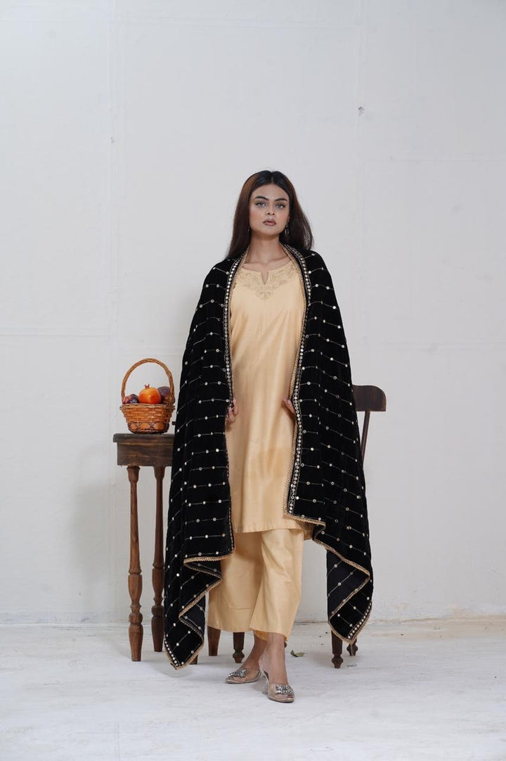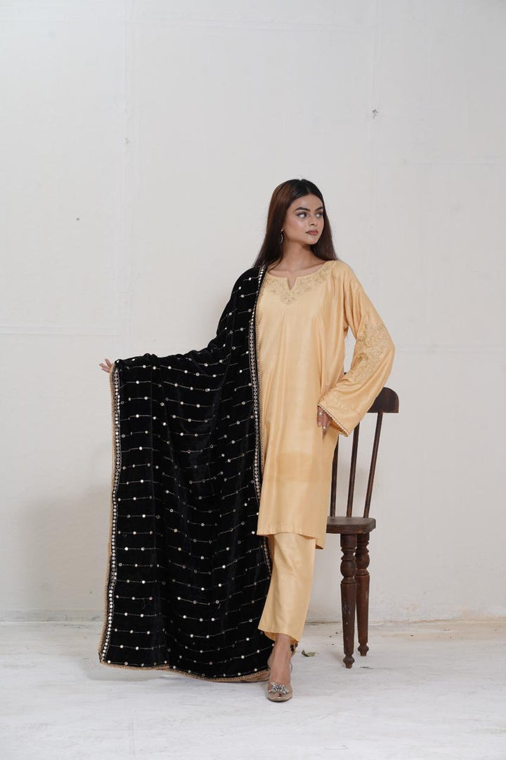 Additional Description: Luxurious Comfort: Large size (90" x 45") for ultimate warmth and draping. Premium Material: Pure velvet for softness and durability. Timeless Design: Self Design pattern with a embroidery plus 9mm sequence selver plain look for classic style. Eye-catching Appeal: 4 Border Diamond pattern offers a unique look. Intricate Craftsmanship: 9mm sequence work on both sides for an artisanal touch. Lightweight & Versatile: Perfect for all seasons and various occasions.